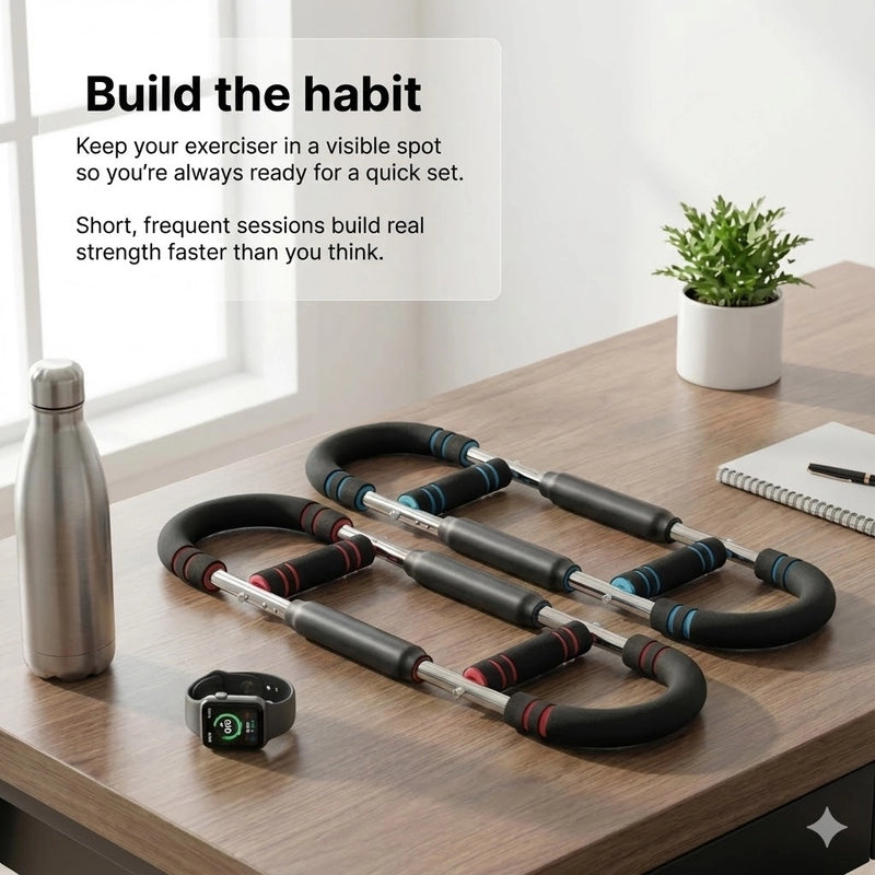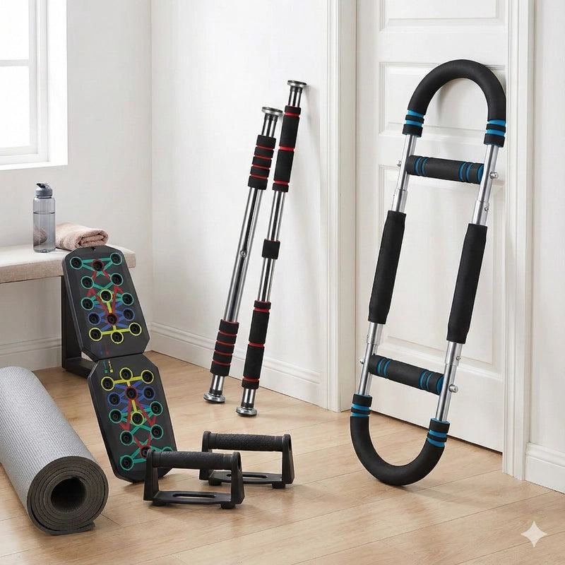 Transform your body in just 20 minutes a day with this complete home workout kit. The set includes a multifunctional push-up board for targeted muscle training, a secure doorway pull-up bar for upper body strength, and an arm exerciser for toned arms. It's the perfect solution for a full-body workout at home.